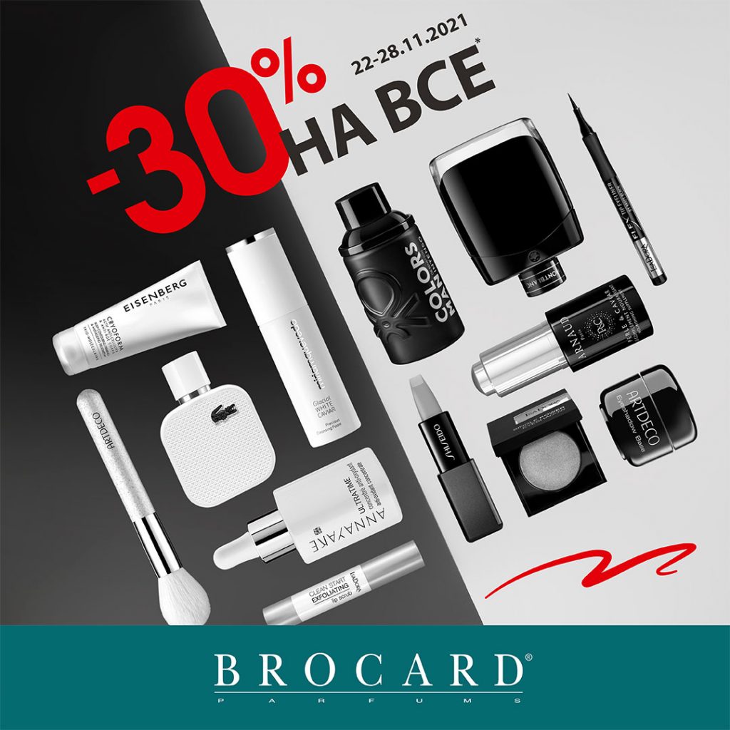 Акція «Чорна п’ятниця: -30% на все!» діє у магазинах парфумерії та косметики BROCARD в Україні 22-28.11.2021 на весь асортимент, окрім подарункових карток, визначеного переліку марок та товарів за спеціальними цінами. Інші знижки не додаються. В акції беруть участь понад 10 тисяч найменувань товарів. Деталі акції та перелік акційних товарів – у консультантів і на brocard.ua.