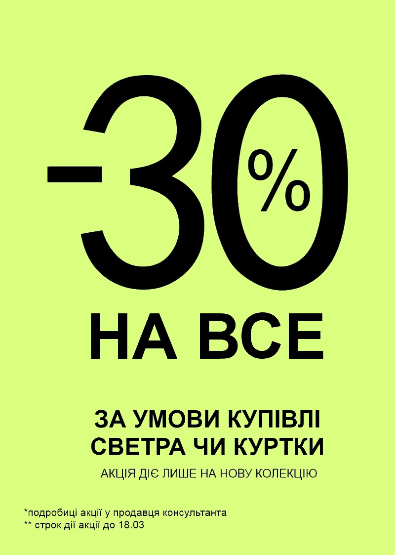 Акція в магазині до 18.03 -30% на всю нову колекцію, за умови купівлі будь якої куртки чи светру з нової колекції.