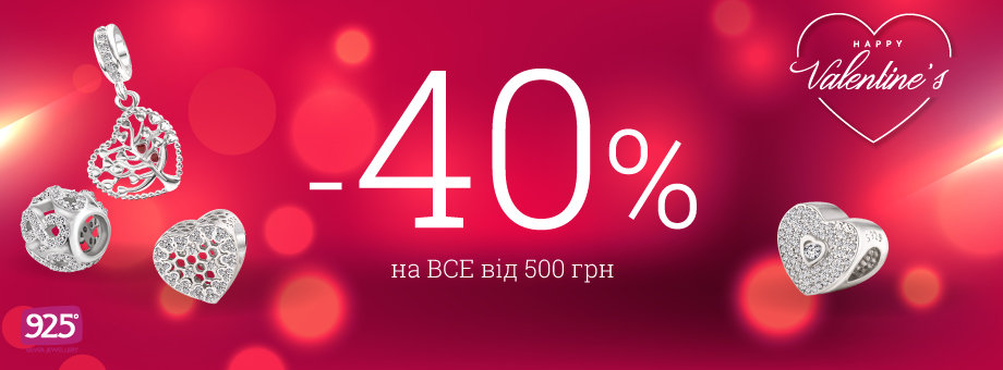 01.02.2019 З 1 до 10 лютого у корнері 925 Silver Jewellery діє знижка -40% на всі прикраси вартістю від 500 грн. Корнер 925 Silver Jewellery знаходиться у ТЦ GLOBUS 1, -1 поверх.
