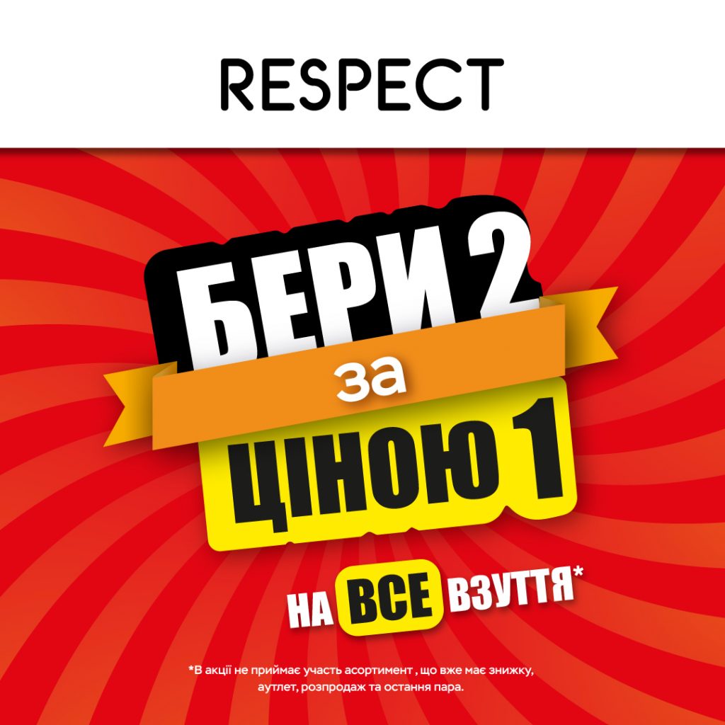 Дві пари взуття по ціні однієї на весь асортимент! Так так! Майже жодних обмежень – береш дві пари взуття, а платиш всього за одну! І це в усіх просторах Respect!