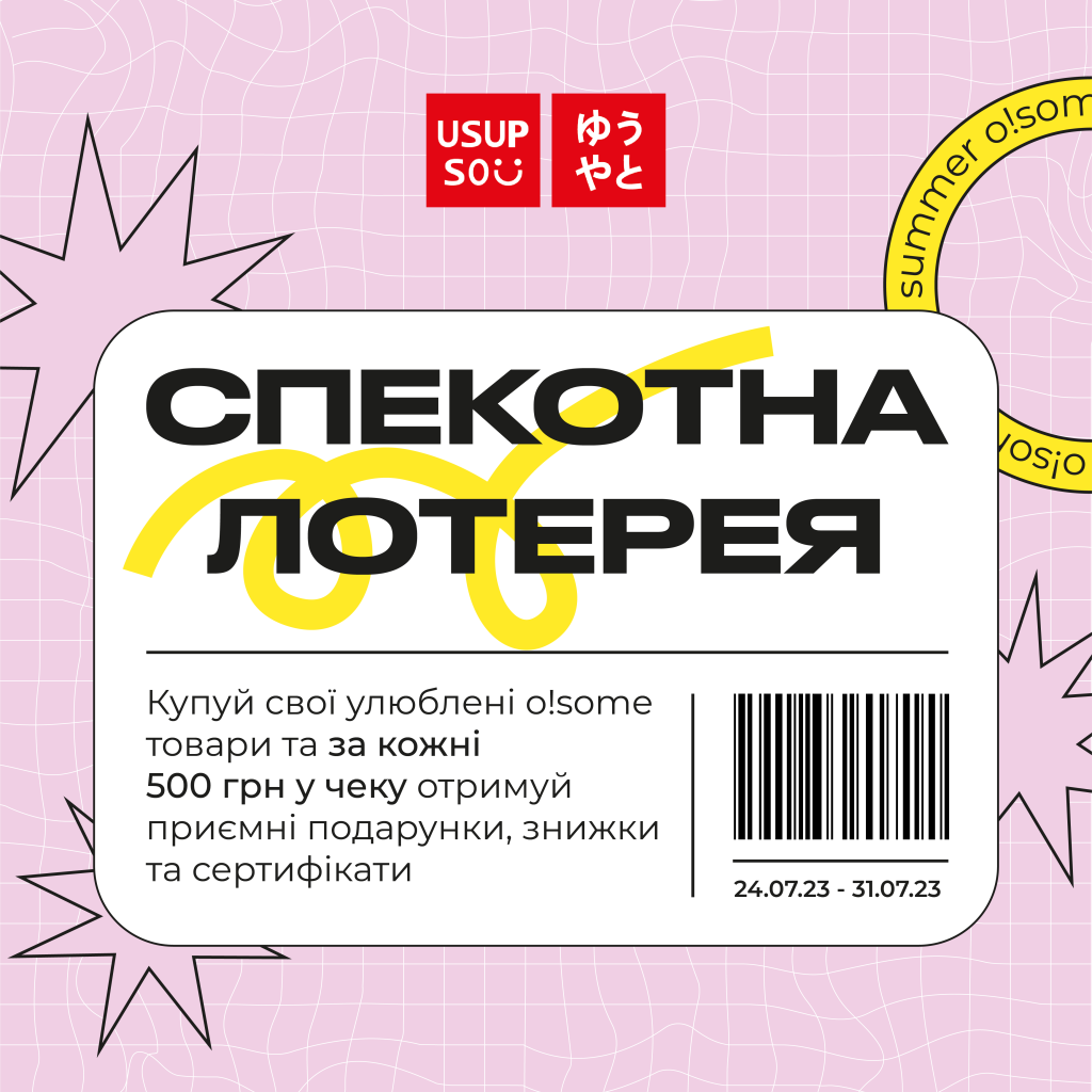 тягни скретч-картку – вигравай приз. В тебе є можливість виграти наступні призи: 1) Знижка на наступну покупку до 50% 2) Подарункові сертифікати на 500 та 1000 грн 3) Подарунки (іграшки, сумки, гаманці, блокноти) Акція діє в магазинах USUPSO / O!SOME в період 24.07.2023-31.07.2023