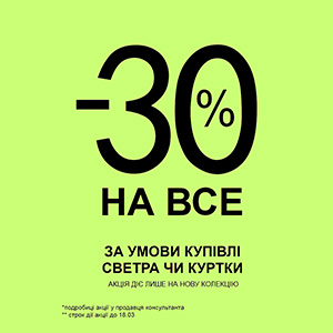 -30% на всю нову колекцію, за умови купівлі будь якої куртки чи светру з нової колекції.