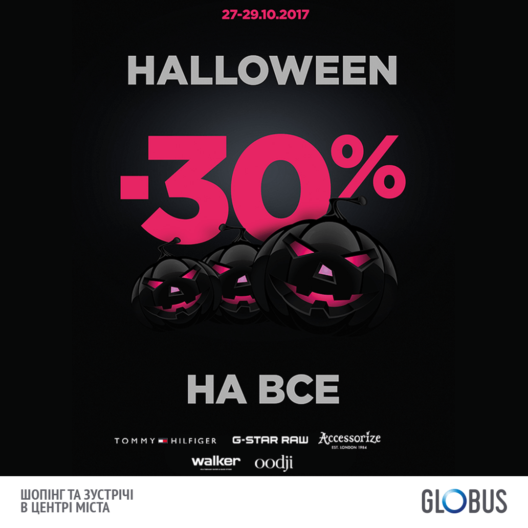 Страшні знижки -30% НА ВСЕ до Halloween в магазинах Tommy Hilfiger, G-Star Raw, Accessorize, WALKER та Oodji в ТЦ Globus.