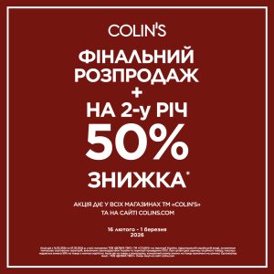 Акція діє з 16 лютого по 1 березня 2026 року включно на сайті colins.com та в діючих магазинах Торгової марки COLIN’S на території України, підконтрольній українській владі, за винятком тимчасово окупованих територій. Детальні умови акції доступні на сайті colins.com та у продавців-консультантів у магазинах.