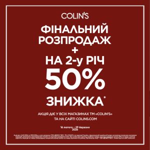 Акція діє з 16 лютого по 29 березня 2026 року включно на сайті colins.com та в діючих магазинах Торгової марки COLIN’S на території України, підконтрольній українській владі, за винятком тимчасово окупованих територій. Детальні умови акції доступні на сайті colins.com та у продавців-консультантів у магазинах.