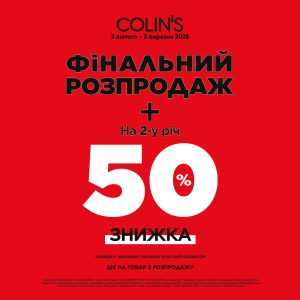 Акція діє з 3 лютого по 2 березня 2025 року включно на сайті colins.com та в діючих магазинах Торгової марки COLIN’S на території України, підконтрольній українській владі, за винятком тимчасово окупованих територій. Детальні умови акції доступні на сайті colins.com та у продавців-консультантів у магазинах.