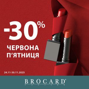 Зустрічай червону п’ятницю і знижки до 30% на хіти парфумерії та косметики у BROCARD. Акція діє з 24 до 30 листопада 2025. Приходь до магазину BROCARD з елементом червоного кольору в своєму образі та отримуй додаткову знижку!