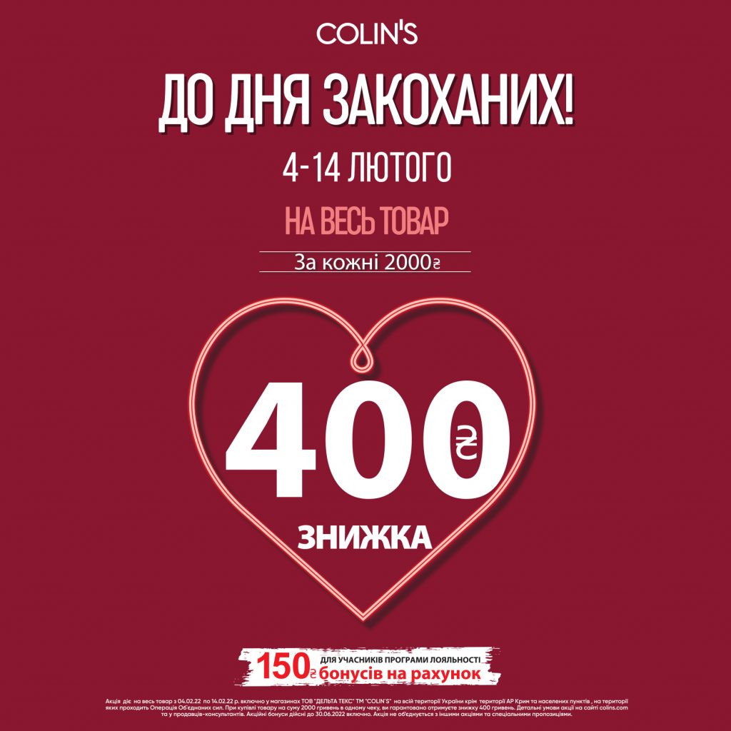 Тільки з 4 по 14 лютого включно: Отримай знижку 400 гривень та 150 бонусів на рахунок за 2000 гривень у чеку ✨ Бонуси нараховуються для учасників програми лояльності COLIN’S Подробиці на касі та на colins.com