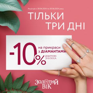 28.06.2024 Час для розкоші з прикрасами від «Золотий Вік»🔥 Додаткова Знижка -10% на прикраси з діамантами. ✅Акція діє з 28.06.2024 по 30.06.2024. «Золотий Вік» — почуття прикрашають❤️