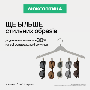 За красою – у Люксоптику! Тут додаткова знижка -30%* на всі сонцезахисні окуляри до Дня краси – щоб ви створили ще більше стильних образів з новими окулярами.