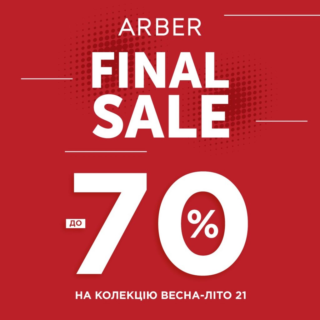 25.08.2021 Final Sale колекції весна-літо 2021 Продовжуємо спекотне літо масштабними знижками! Останній розпродаж сезону: до 70% на весь товар з колекції ARBER весна-літо 2021. Не пропустіть божевільні знижки в ARBER! Акція діє з 25.08 до 15.09 включно.