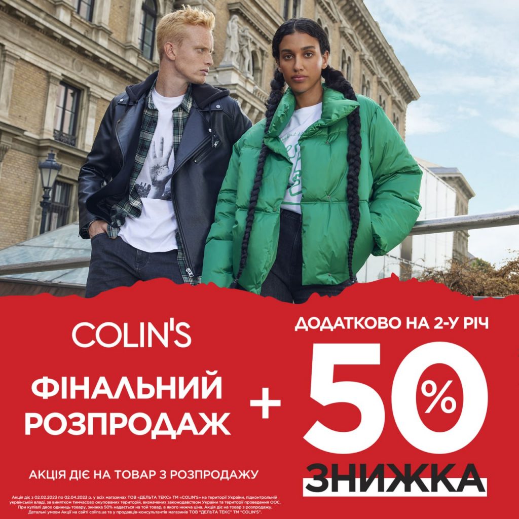 Фінальний розпродаж у COLIN’S!Максимальні знижки на зимову колекцію з додатковою вигодою: кожна друга річ зі знижкою у чеку за пів ціни!Подробиці у продавців консультантів COLIN’S Вдалого шопінгу!