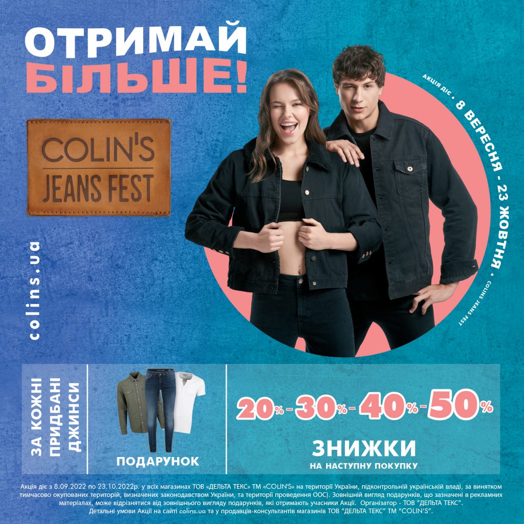 Купуй джинси та отримуй миттєві подарунки! За кожні придбані джинси COLIN’S на касі ти отримуєш виграшну скрейч-картку. Під захисним покриттям на тебе чекають знижки від 20% до 50% на наступну покупку або подарунок: сорочка, футболка чи навіть джинси! А ще, для зареєстрованих в програмі лояльності COLIN’S діє кешбек 5% від покупки бонусами. Подробиці на сайті colins.ua та у продавців-консультантів COLIN’S JEANS FEST – ОТРИМАЙ БІЛЬШЕ!JEANS FEST у COLIN’S