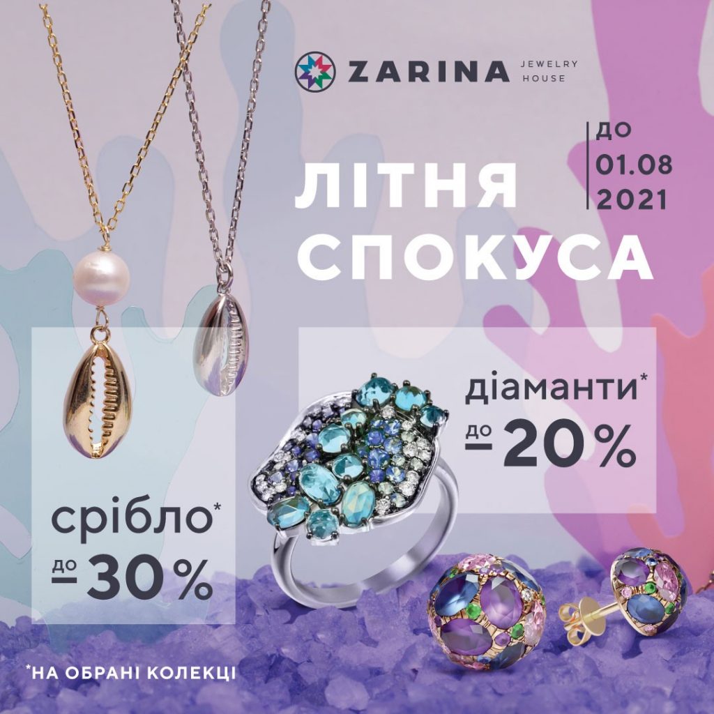 Спокуслива літня пропозиція від ZARINA: з 21 червня до 1 серпня — знижки до -30% на обрані колекції зі срібла та з діамантами 💎