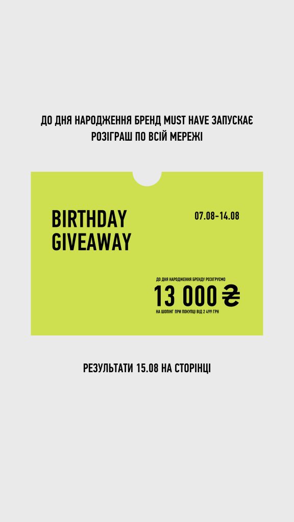 10.08.2023 “Новина До Дня народження бренд MUTS HAVE запускає розіграш по всій мережі Зробіть покупку з 07.08 по 14.08 від 2499 грн одним чеком та отримайте шанс виграти ШОПІНГ на 13 000 грнРезультати 15.08 насторінці @musthaveua❤️Хай щастить!”