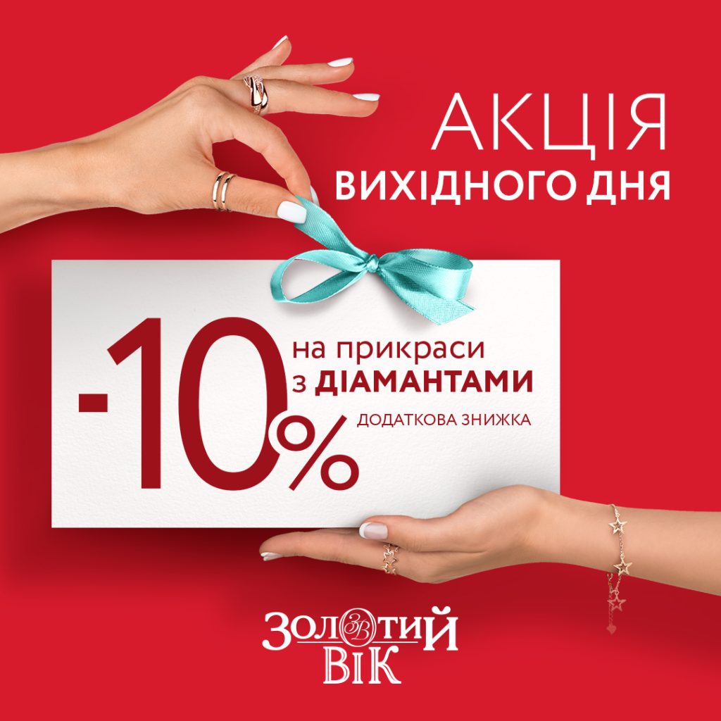 07.11.2023 Золотий Вік дарує додаткову знижку на прикраси з діамантами -10% Акція діє з 7 до 15 листопада 2023 року Детальні умови можна дізнатись у продавців-консультантів.