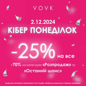02.12.2024 Не пропустіть Кіберпонеділок у VOVK! 🌟 2 грудня: 📍 -25% на все 📍 До -70% на категорії “Розпродаж” і “Останній шанс”