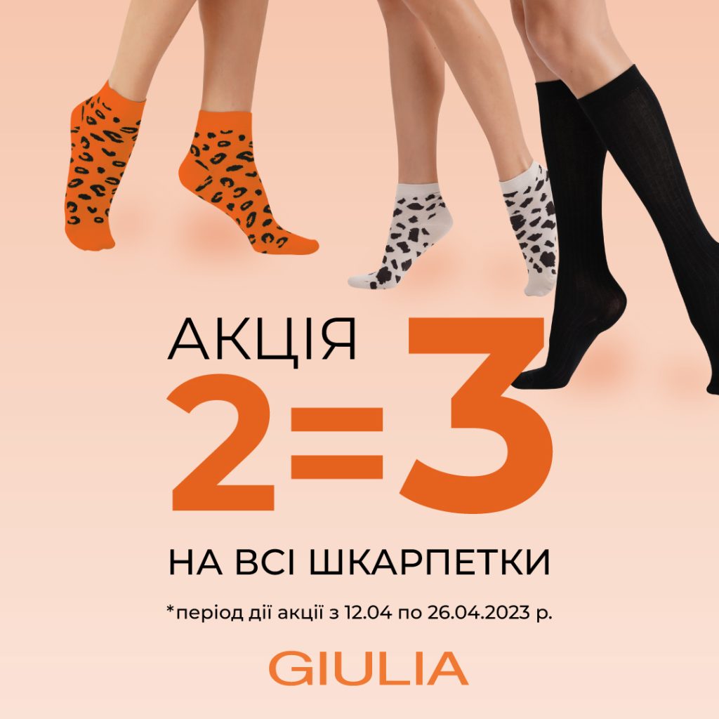 20.04.2023 НЕЙМОВІРНА АКЦІЯ в GIULIA! 😱 2=3 НА ВСІ ШКАРПЕТКИ! Обирай шкарпетки для всієї сім’ї. *період дії акції з 12.04.2023 по 26.04.2023 р. у всіх магазинах GIULIA. *деталі акції запитуйте у продавців-консультантів.