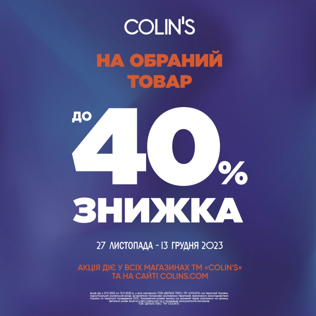 Оновлюй свій гардероб з COLIN’S! Знижки до -40% з 27.11.2023 по 13.12.2023 включно в магазинах COLIN’S на сайті colins.com. До зустрічі в COLIN’S!