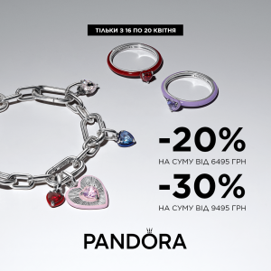 16.04.2026 Особлива пропозиція від Pandora Купуйте прикраси на суму від 6 495 грн та отримайте 20% знижки, а на суму від 9 495 грн — 30%. ️ Лише з 16 по 20 квітня включно * Деталі — у консультантів магазину Pandora нашого ТЦ.