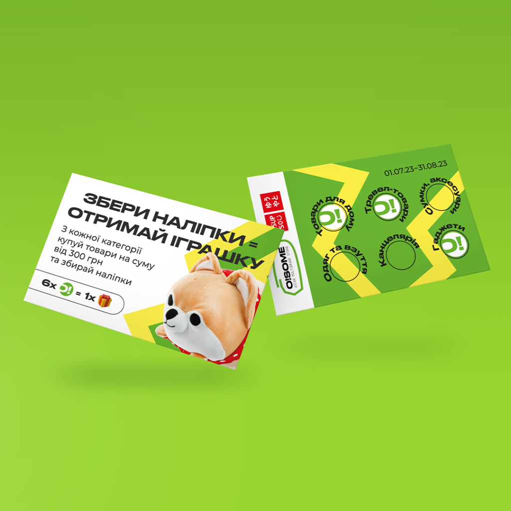для дому, одяг та взуття, гаджети, тревел-товари, канцелярія, аксесуари протягом Липня-Серпня. Зібравши всі 6 наліпок – отримуй у подарунок М’яку іграшку. Акція діє в усіх магазинах мережи O!SOME / USUPSO з 01.07.2023 по 31.08.2023.отримуй у подарунок М’яку іграшку O!SOME