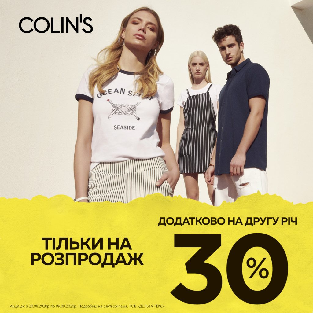 25.08.2020 Подвійна вигода з COLIN’S: Колекція весна-літо COLIN’S зараз з вигодою до 70%! А також діє додаткова знижка 30% на другу одиницю у чеку на весь асортимент розпродажу! Подробиці у продавців-консультантів. До зустрічі у COLIN’S;)