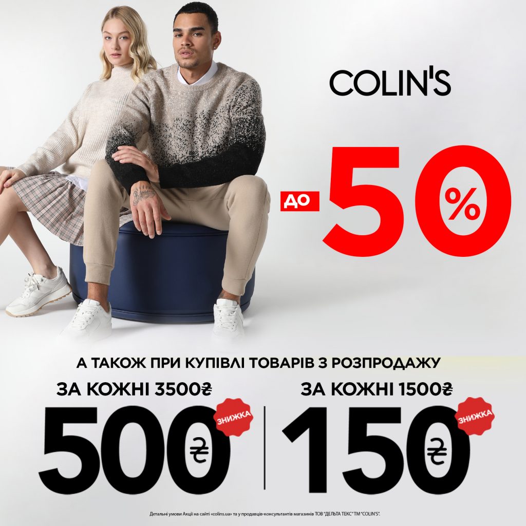 Знижка до 50% на зимову колекцію COLIN’S, а також додаткова миттєва знижка 150 гривень на касі за чек від 1500 гривень, або навіть знижка 500 гривень за чек від 3500 гривень.