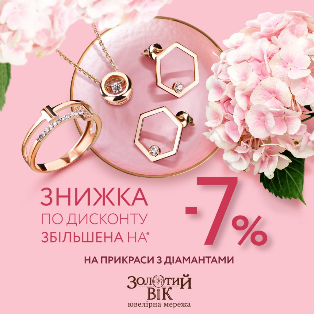 14.06.2021 Вигідна пропозиція на прикраси з діамантами від “Золотий Вік” 💎 Знижка по дисконту збільшена на -7% 🔥 Акція діє з 10.06.2021 по 07.07.2021. ⏰ Детальні умови дізнавайся у продавців-консультантів або за номером гарячої лінії 0 800 309 209.