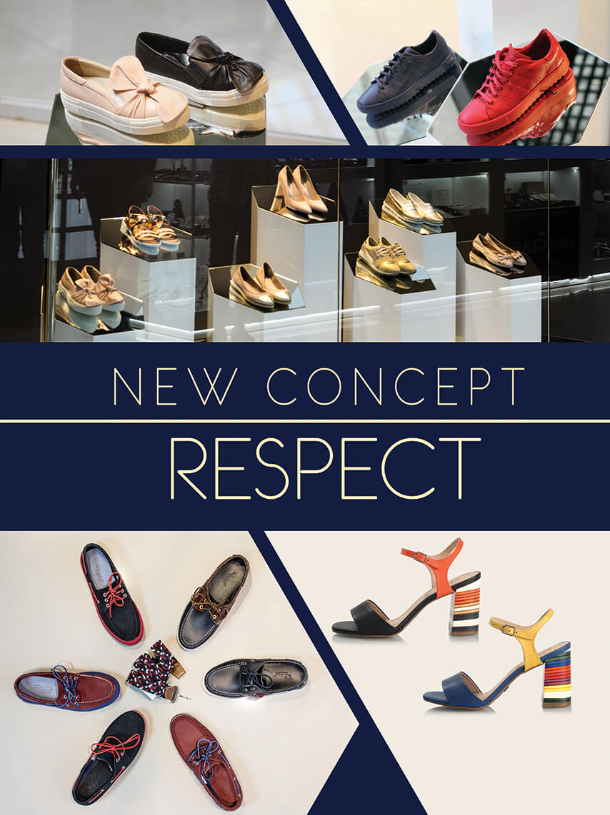 RESPECT — монобрендовий салон взуття, який працює в Україні з 2004 року. На сьогоднішній день відкрито 11 брендових магазинів в різних куточках країни. Асортимент RESPECT включає в себе популярні моделі вишуканих човників, спортивні сліпони та кросівки, комфортні та стильні мокасини або еспадрільі, класичні туфлі або туфлі в стилі smart-casual, модні сабо та комфортні сандалі.