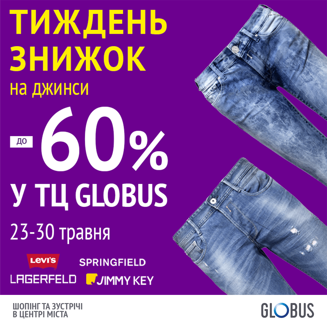 Завітайте до ТЦ Globus з 23 до 30 травня та придбайте джинси в улюблених магазинах Levi’s, Springfield, Karl Lagerfeld та Jimmy Key зі знижкою до -60%!