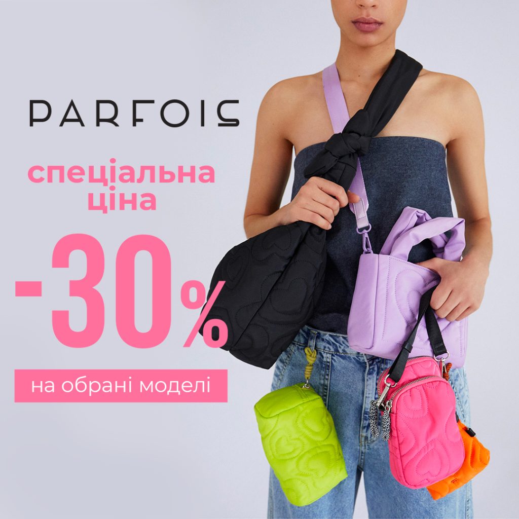 08.04.2023 Parfois 🌸Спеціальна пропозиція від Parfois на нову колекцію🌸 Додавай стильних та яскравих аксесуарів в свої весняні образи🦋 Знижка -30% на обрані моделі із сезону весна-літо‘23 з 04.04.23 по 01.05.23
