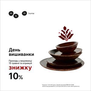 14.05.2025 Святкуємо День вишиванки разом! Приходь 15 травня у вишиванці до будь-якого з магазинів МВМ HOME та отримай знижку 10% на неакційні товари. Підтримай традиції та заощаджуй кошти на подарунки собі та рідним. Акція діє 15 травня 2025 року у роздрібних магазинах МВМ HOME
