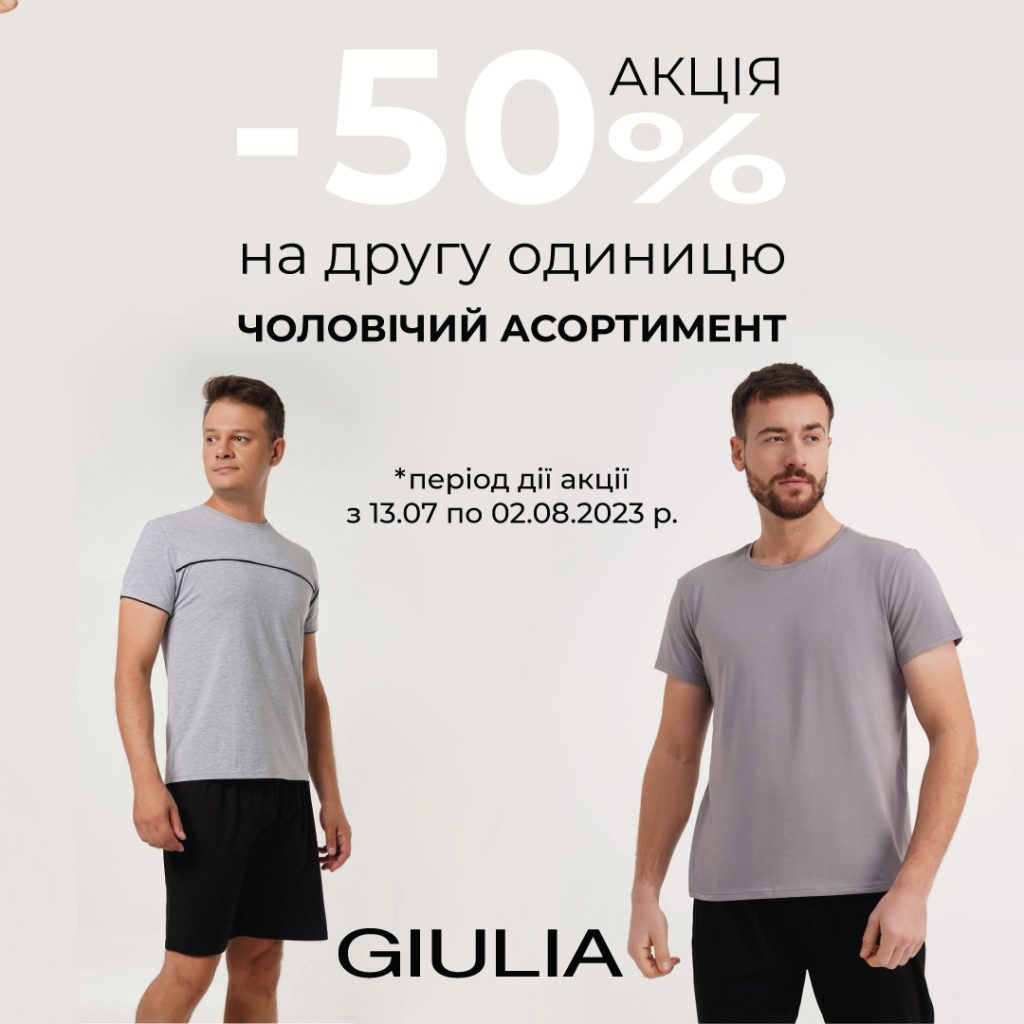 18.07.2023 АКЦІЯ! 😍 В GIULIA -50% на другу одиницю ВЕСЬ ЧОЛОВІЧИЙ АСОРТИМЕНТ! *акція діє з 13.07 по 02.08.2023 у всіх магазинах GIULIA на обраний асортимент. *деталі акції запитуйте у продавців-консультантів.