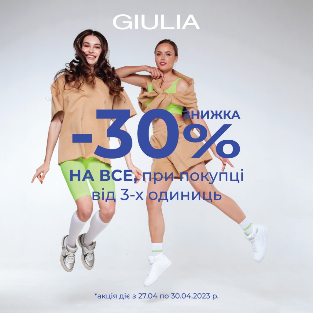 01.05.2023 АКЦІЯ! 💥 В GIULIA ЗНИЖКА -30% НА ВСЕ! *при покупці від з-х одиниць. ТІЛЬКИ 4 ДНІ! 27.04-30.04.2023! *акція діє з 27.04.2023 по 30.04.2022 у всіх магазинах GIULIA. *деталі акції запитуйте у продавців-консультантів.