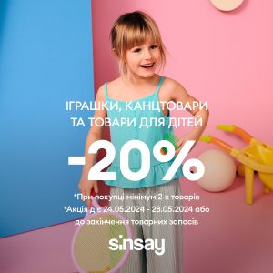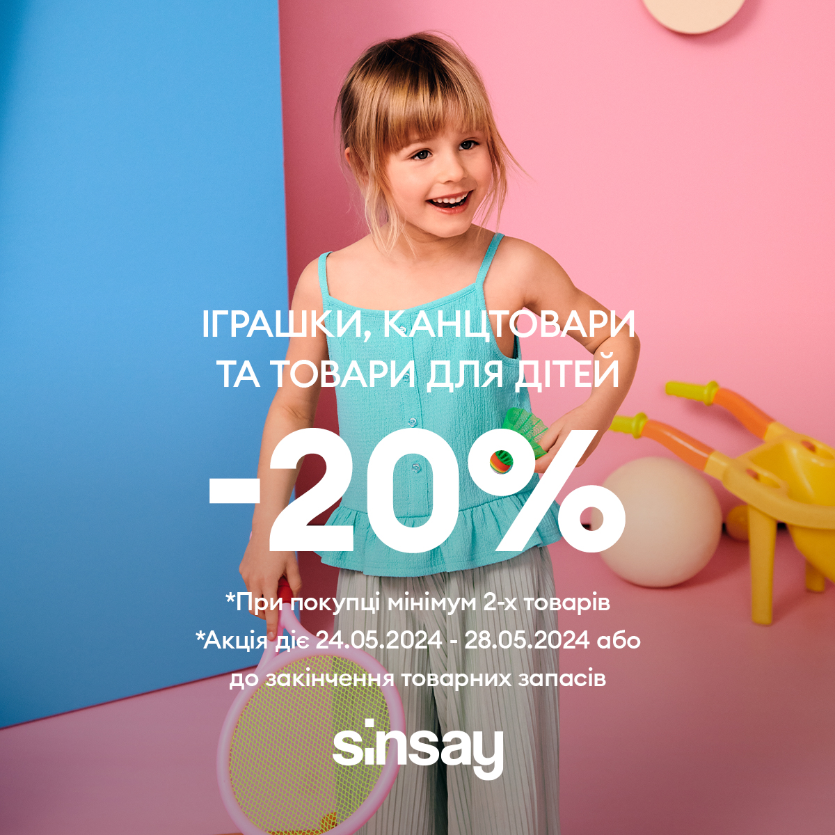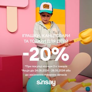 22.05.2024 В Sinsay акція! -20% знижки на іграшки, канцтовари та товари для дітей при покупці від 2х одиниць товару. Акція діє з 24.05.2024 до 28.05.2024 або до закінчення товарних запасів