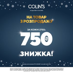 Акція діє на визначений товар з 12 грудня 2024 по 8 січня 2025 включно на сайті colins.com та у діючих магазинах COLIN’S на всій території України, за винятком тимчасово окупованих територій. Детальні умови акції на сайті colins.com та у продавців-консультантів.