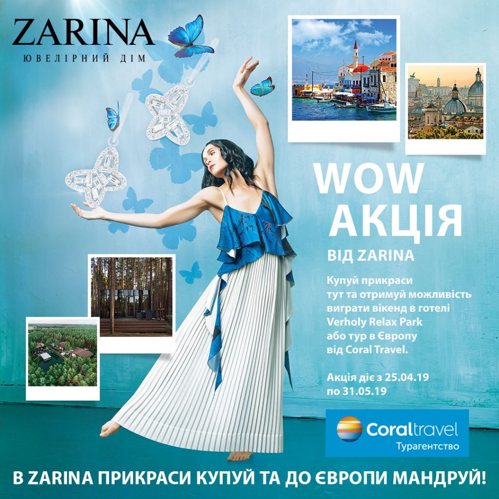 З 25.04.19 по 31.05.19 купуй прикраси в бутіку Ювелірного Дому ZARINA у ТЦ GLOBUS 1, 1 поверх та отримуй можливість виграти вікенд в готелі Verholy Relax Park або тур в Європу та інші подарунки.