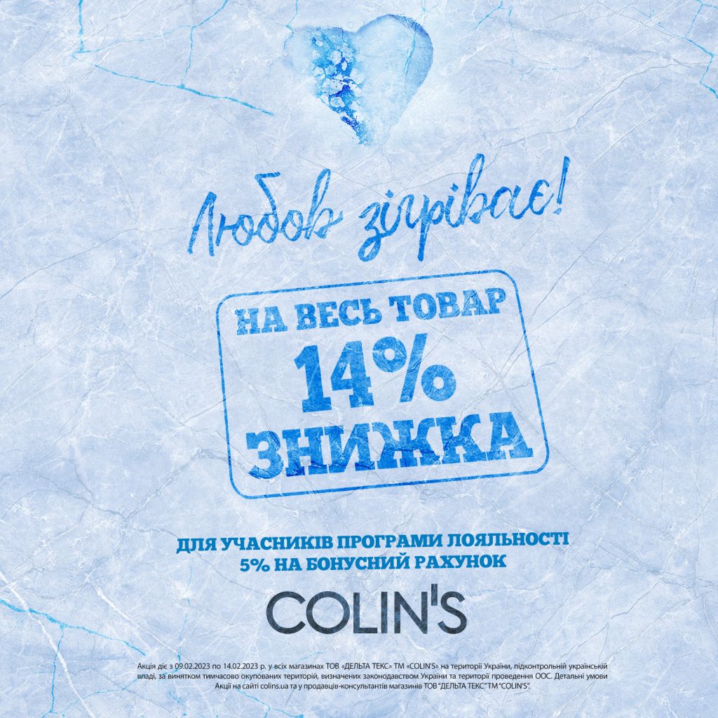 Любов зігріває! Тепла знижка 14% на все у COLIN’SОбирай подарунки для себе та близьких вигідно:Тільки 9 – 14 лютого 2023 діє знижка 14% на весь асортимент в COLIN’SА для учасників програми лояльності також надається 5% від вартості чеку на бонусний рахунокПодробиці на касі магазину та на colins.uaНайкращий час для турботи з COLIN’S!