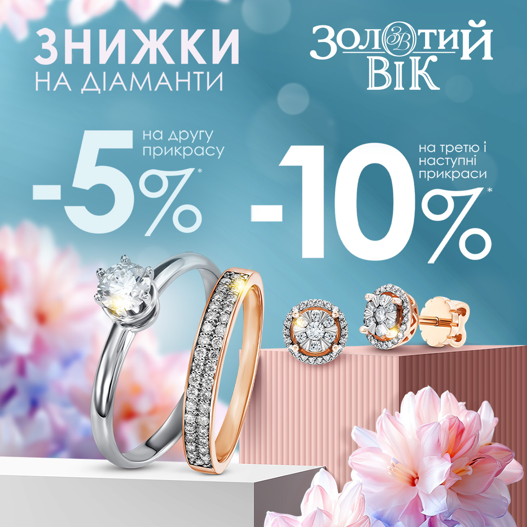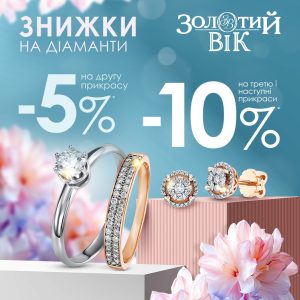 Обирайте прикраси з діамантами зі знижкою -5% на другу та -10% на третю та наступні прикраси в чеку.